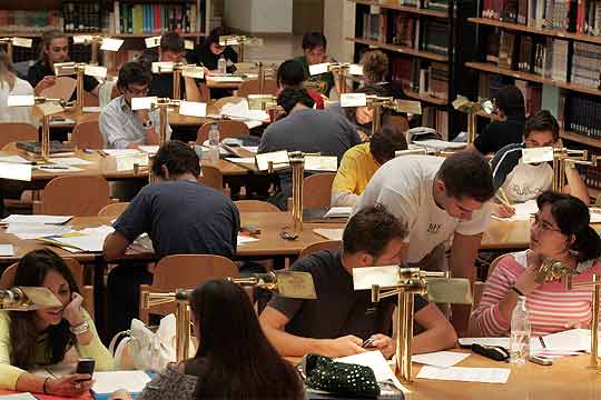 El segundo hecho es el que ahora me interesa. De pronto, esos espacios de silencio y estudio, las bodegas de los libros, las bibliotecas, se ven desbordadas por ocupantes que, como al asalto, se agolpan desde primera hora de la mañana buscando un hueco, por mínimo que sea, en el que realizar la dura travesía de una jornada de estudio. Es víspera ya de los temidos exámenes. ¡Cuántas horas de angustiosa espera, de lucha a brazo partido con esa asignatura que no acaba de fijarse en la cabeza! ¡Cuántos encuentros fortuitos, entre esquema y resumen, que terminan en un amor de verano, o pueden ser el comienzo de toda una gran historia! Parafraseando a Lope: quien estudió, lo sabe. Así fue, y así será, y así está bien.